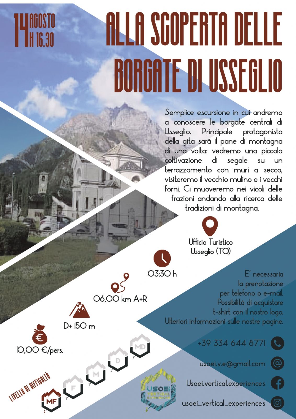 Dopo esserci trovati nella zona centrale del paese, imboccheremo i facili sentieri che collegano le varie borgate di Usseglio. La gita avrà come tematica principale il percorso del pane di montagna di una volta. Andremo quindi a visitare i vecchi forni e il vecchio mulino e anche una piccola coltivazione di segale, il cereale di montagna per eccellenza, che veniva utilizzato per svariati fini, non solo alimentari!! Oltre a ciò transiteremo nei vicoli tra le case, dove potremo notare la presenza di vecchi attrezzi, vedremo gli antichi terrazzamenti costruiti a secco, visiteremo una vecchia cappella. Insomma se vuoi conoscere qualche angolo di Usseglio questa è la gita giusta per te!