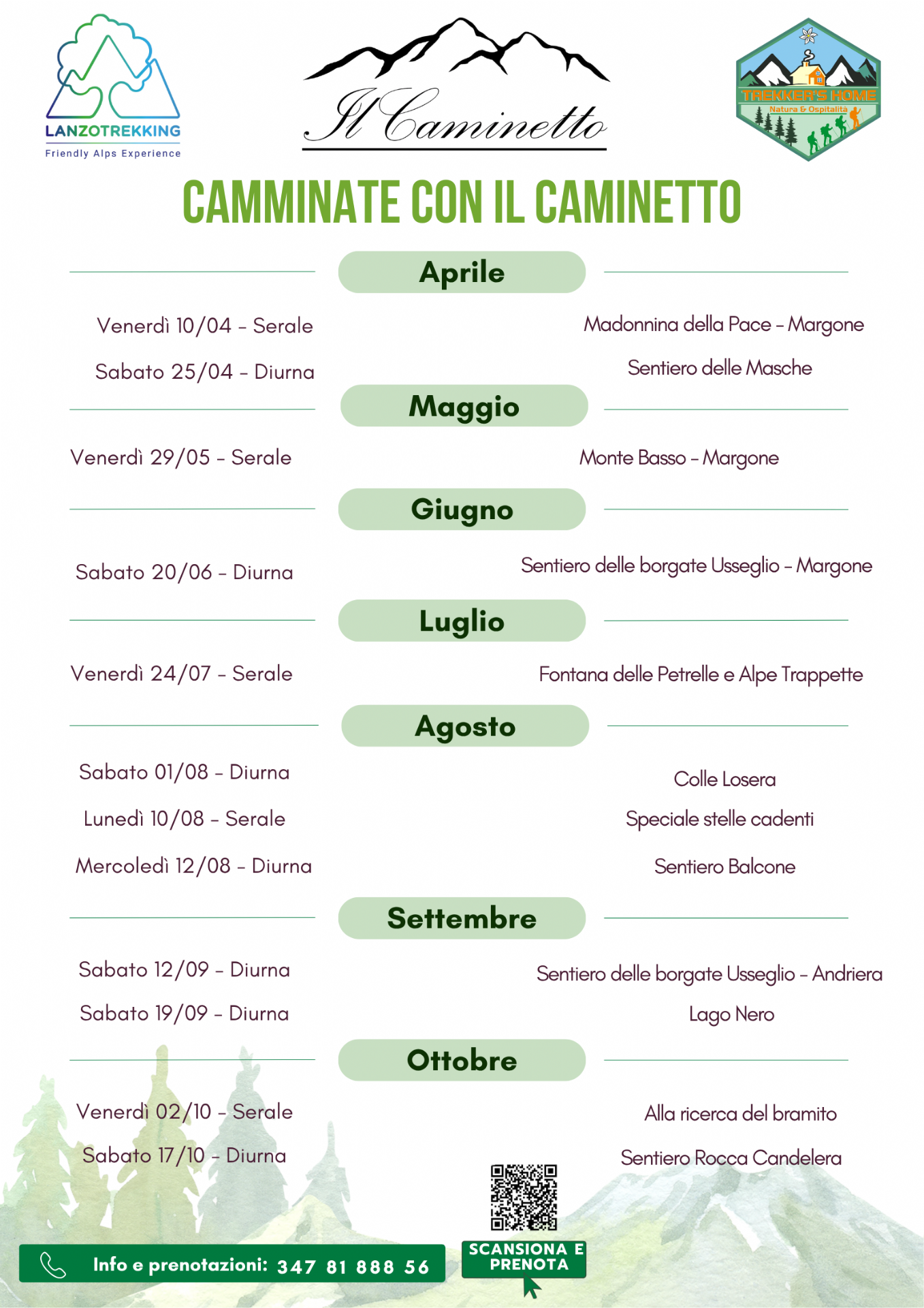 Calendario di camminate da aprile fino ad ottobre in collaborazione con le guide escursionistiche di Trekker's Home (Laura Grosa e Alessandro Vangi) e Lanzo Trekking (Andrea Mantelli) organizzate dal Ristorante "Il Caminetto" di Margone-Usseglio