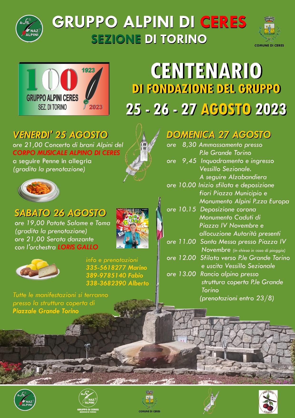 - ore 13:00: rancio Alpino presso struttura coperta Piazzale Grande Torino (gradita la prenotazione entro il 23/8)