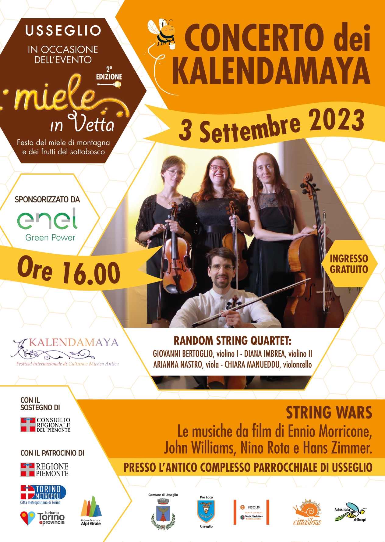 - In occasione dell'evento "Miele in vetta", Festa del miele di montagna e dei frutti del sottobosco, si terrà il concerto dei "Random String Quartet" presso l'antico complesso parrocchiale di Usseglio;