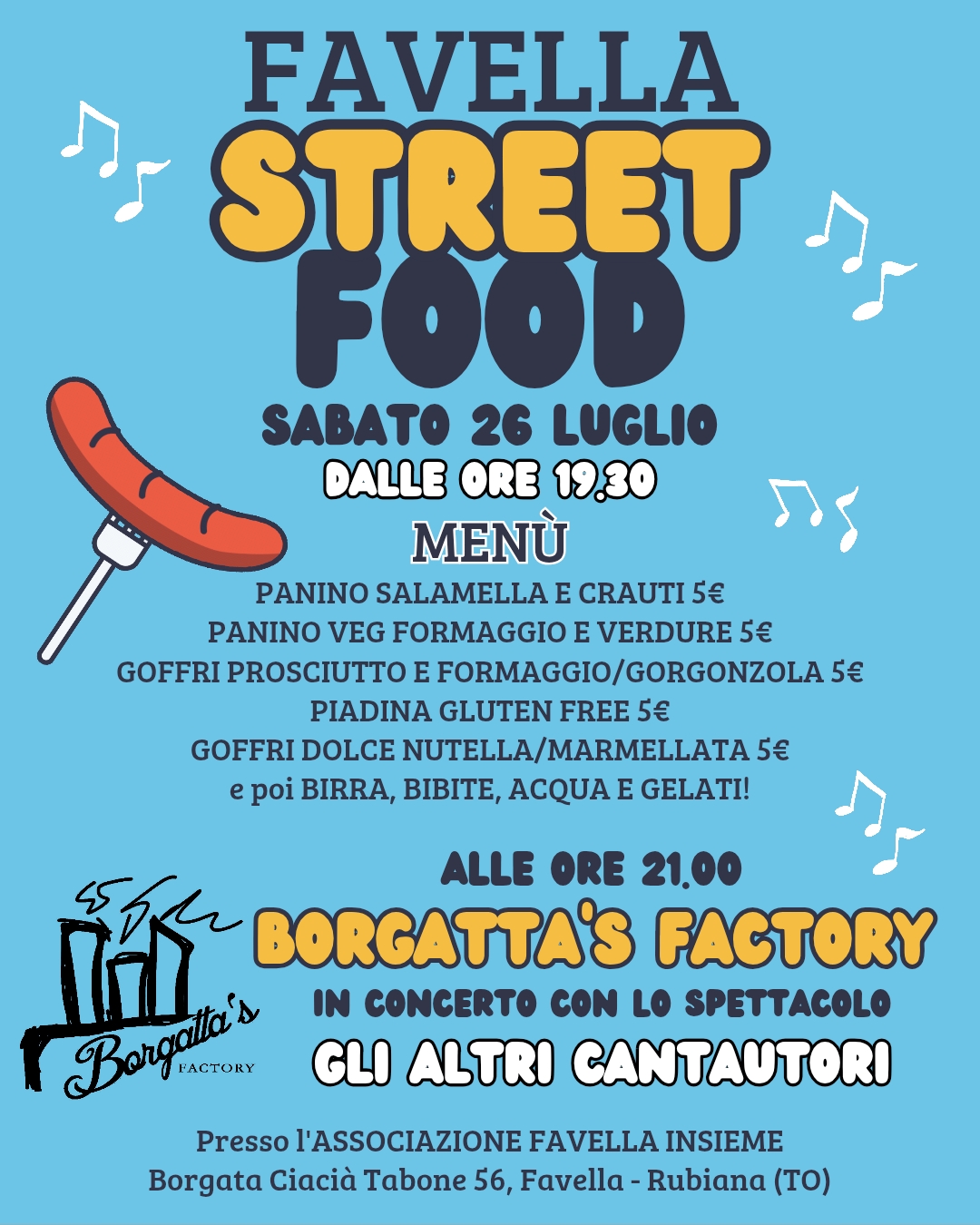 Sabato 26 luglio, a partire dalle 19:30, si terrà un appuntamento con il Favella Street Food. Potrai gustare alcune specialità semplici e gustose, tra cui: