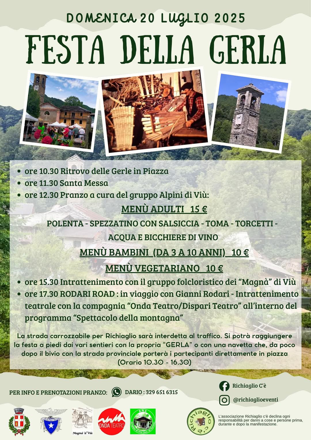 🚶♂️ Come arrivare: La strada carrozzabile per Richiaglio sarà chiusa al traffico. Potrai raggiungere la festa a piedi, portando con te la tua gerla, oppure con una navetta che, dal bivio con la strada provinciale, ti accompagnerà direttamente in piazza (Orario navetta: 10:30 - 16:30).