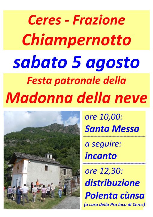 ore 12:30 distribuzione di polenta Concia a cura della Pro Loco di Ceres, per prenotazione chiamare 3491907739