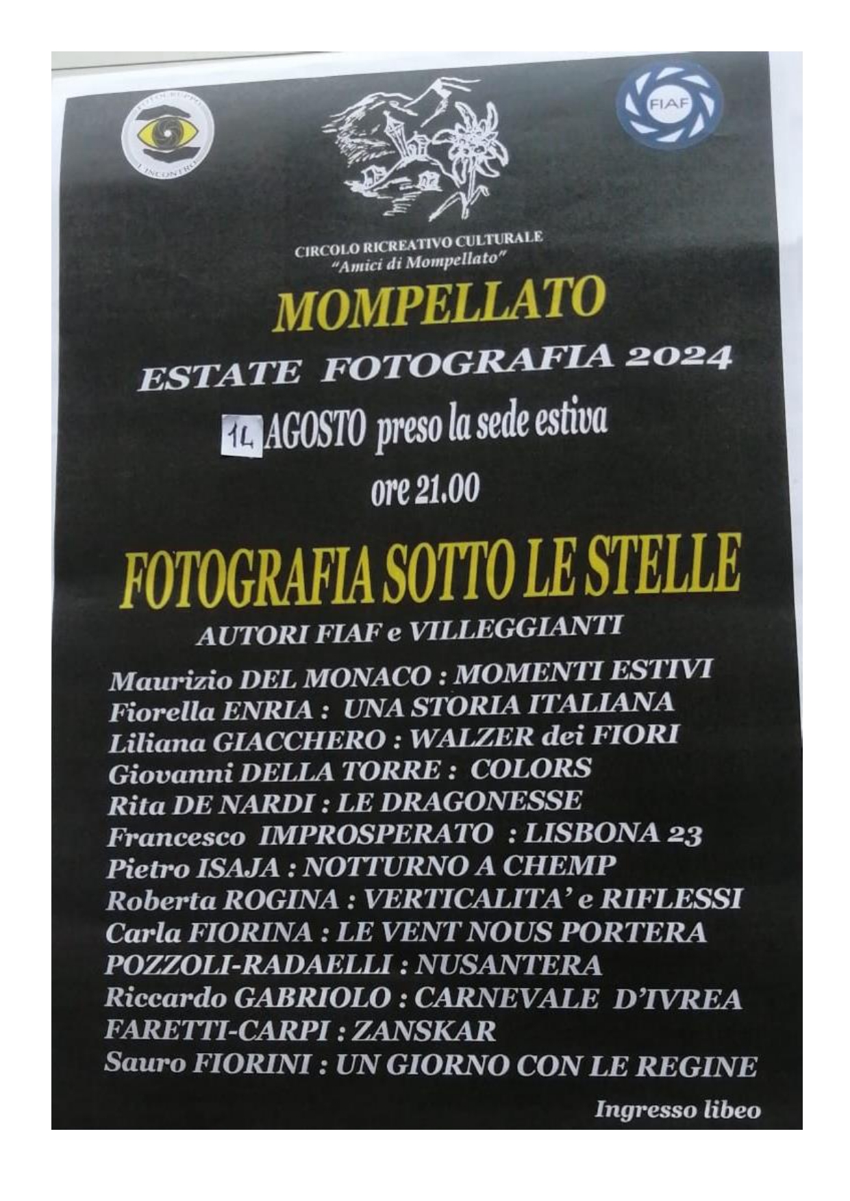 Mercoledì 14 agosto gli Amici di Mompellato organizzano una mostra fotografica alle ore 21,00 presso la loro sede estiva.