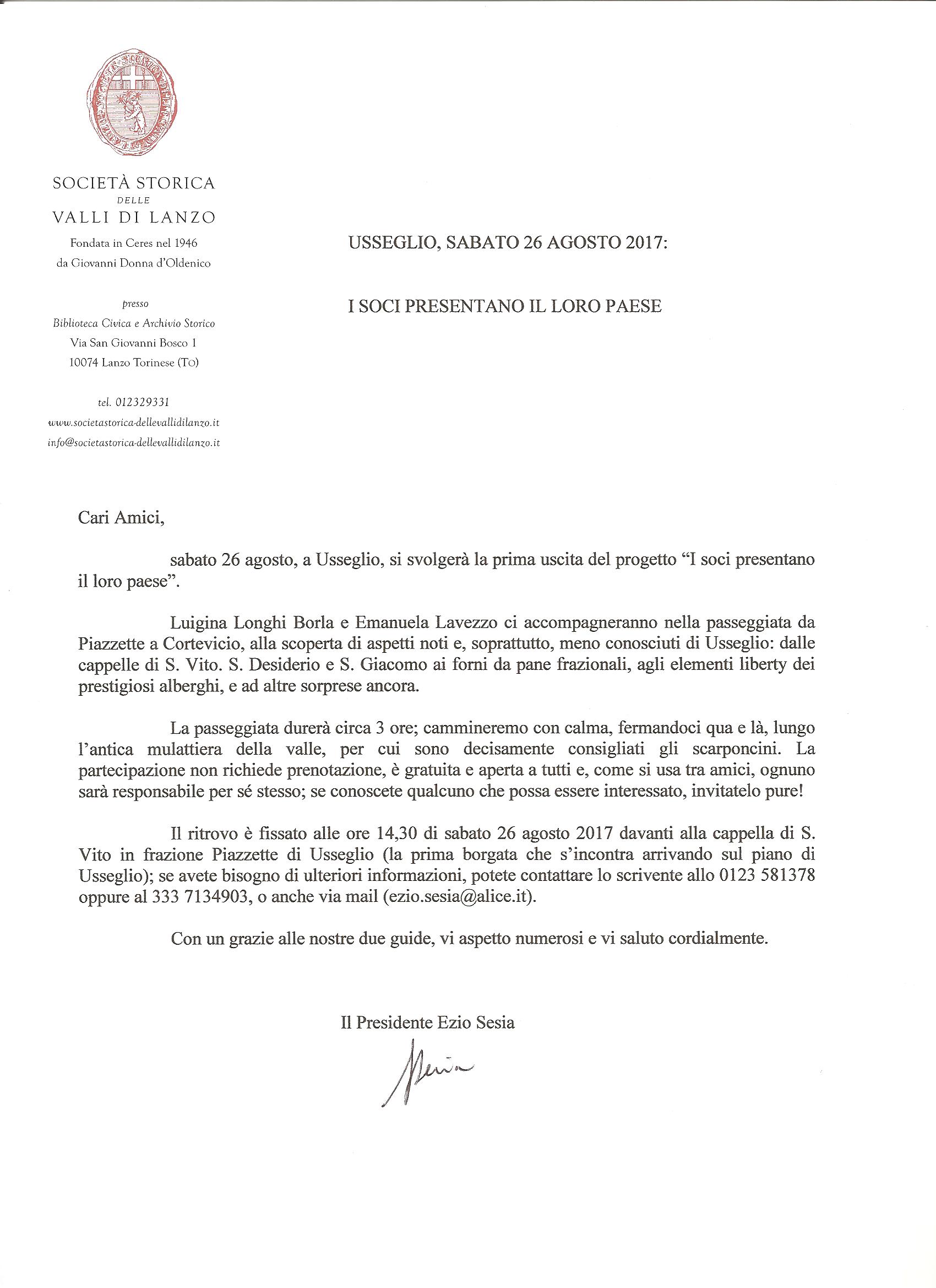 Il ritrovo è fissato alle ore 14:30 di sabato 26 agosto 2017 davanti alla cappella di S. Vito in frazione Piazzette di Usseglio ( la prima borgata che si incontra arrivando sul piano di Usseglio ); se avete bisogno di ulteriori informazioni, potete contattare lo scrivente allo 0123 581378 oppure al 333 7134903, o anche via mail (ezio.sesia@alice.it).