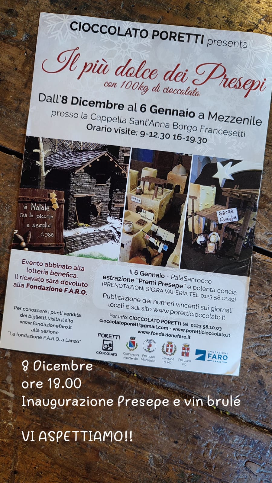 "Il più Dolce dei Presepi": il tradizionale Presepe costruito da Cioccolato Poretti con 100 kg di cioccolato sarà visitabile presso la Cappella Sant'Anna del Castello Francesetti di Mezzenile dall'8 dicembre 2022 al 6 gennaio 2023.