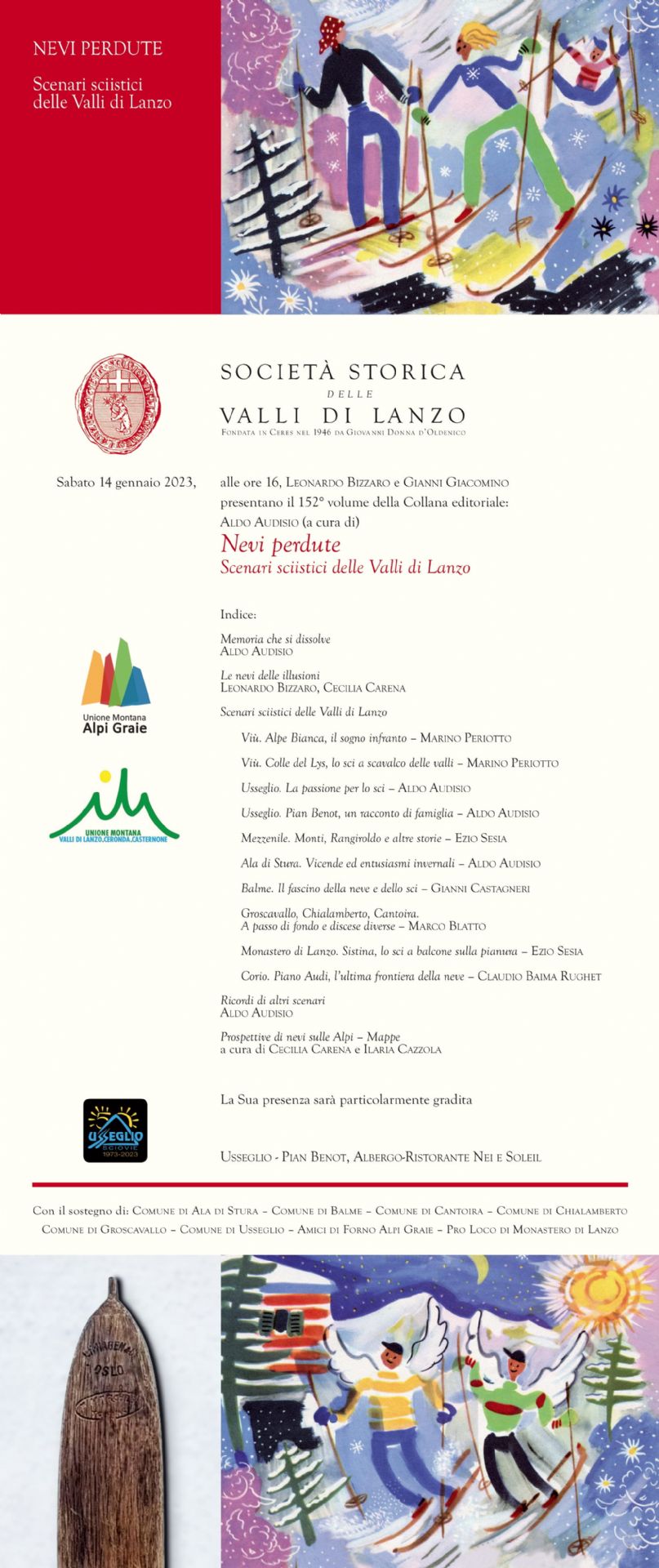Il 14 GENNAIO alle ORE 16, nelle sale dell’ALBERGO-RISTORANTE NEI E SOLEIL a USSEGLIO - PIAN BENOT – scelto in linea con lo spirito che ha caratterizzato il lavoro, in continuo confronto con il territorio e le realtà locali –, cuore della stazione che quest'anno festeggia cinquant'anni d'attività, verrà presentato “NEVI PERDUTE. SCENARI SCIISTICI DELLE VALLI DI LANZO”, a cura di Aldo Audisio. Il volume della Società Storica delle Valli di Lanzo raccoglie i sogni di locali e di villeggianti che hanno creduto nei loro progetti e hanno combattuto confrontandosi con la quotidianità, che hanno costruito e gestito impianti di risalita e hanno sfidato la carenza di neve; sono le avventure di persone che hanno scritto con il loro impegno tante storie legate agli sport invernali. [Testi di A. Audisio, C. Baima Rughet, L. Bizzaro, M. Blatto, C. Carena, G. Castagneri, I. Cazzola, M. Periotto, E. Sesia].