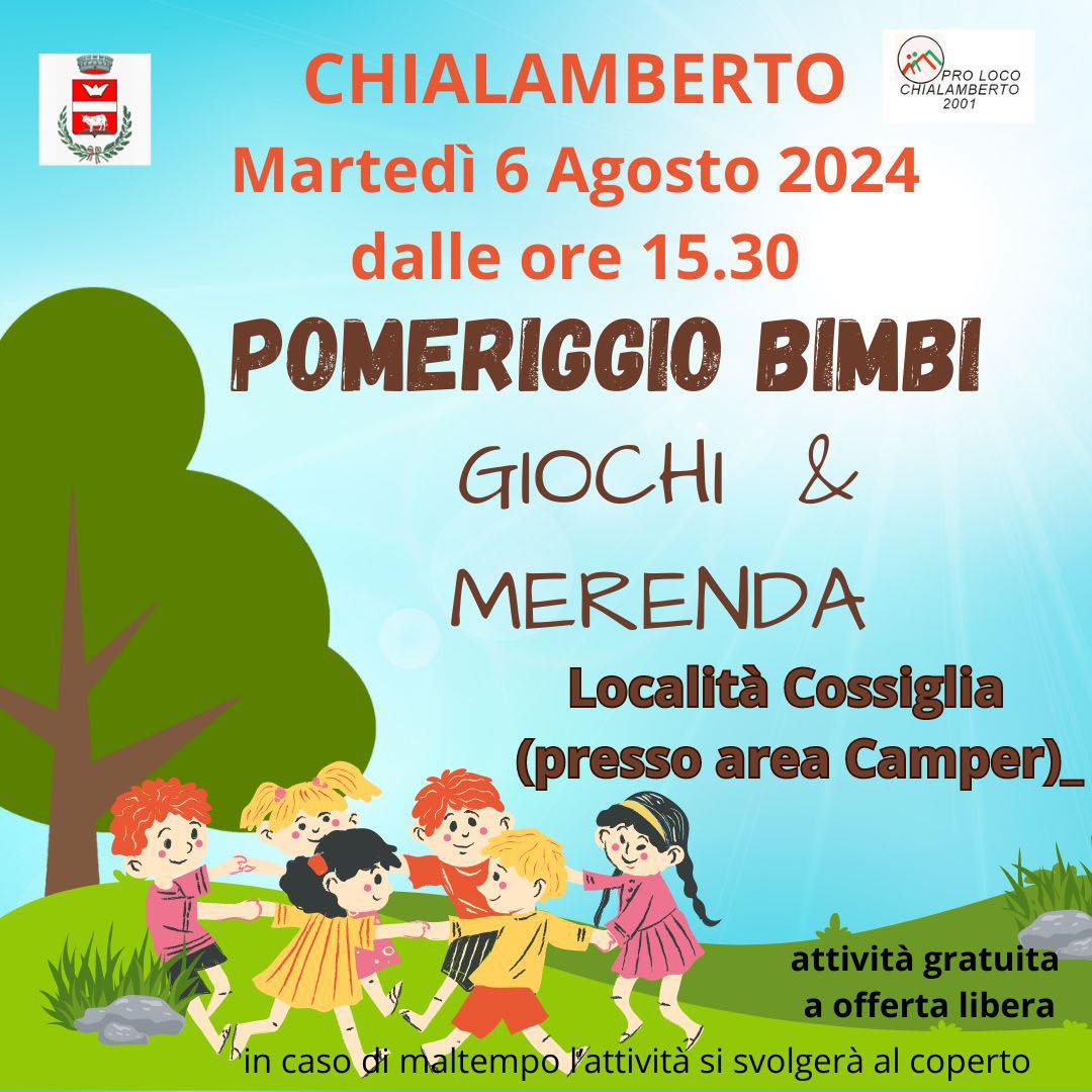 Martedì 06 agosto la Pro Loco di Chialamberto dalle ore 15,30 organizza "POMERIGGIO BIMBI - Giochi & merenda" presso l'Area Camper località Cossiglia (Chialamberto).