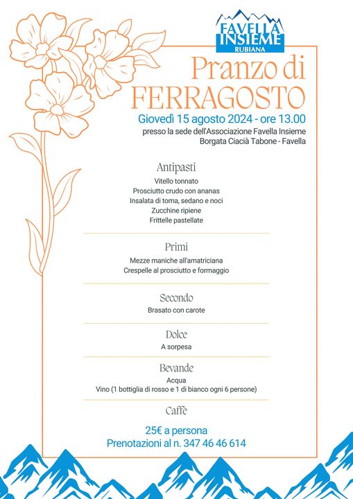 Giovedì 15 agosto l'Associazione Favella Insieme organizza alle ore 13,00 il PRANZO DI FERRAGOSTO presso la sede dell'associazione nella Borgata Ciacià Tabone - Favella.