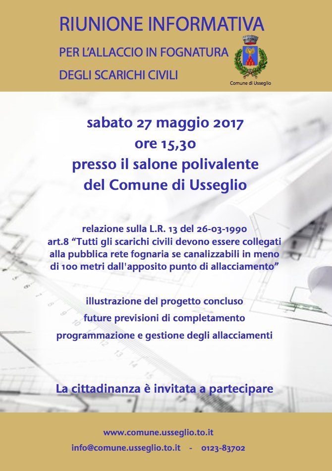 alle ore 15,30 presso il salone polivalente del Comune di Usseglio si terrà una riunione informativa per l'allaccio in fognatura degli scarichi civili