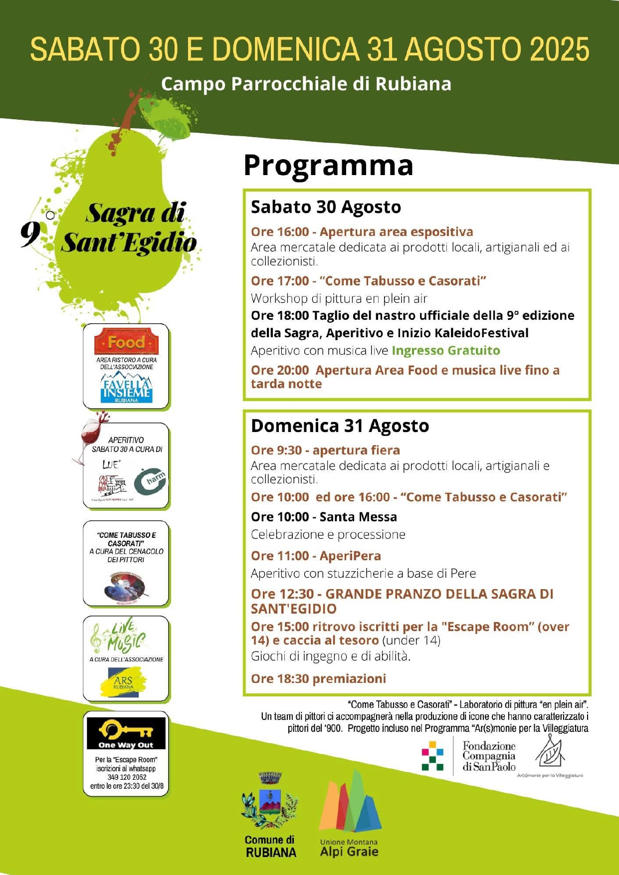 - ore 18:00 - taglio del nastro ufficiale della 9° edizione della Sagra, aperitivo e inzio KaleidoFestival