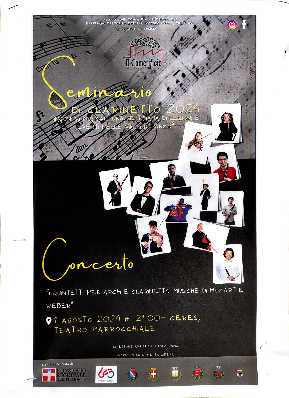 Giovedì 1 agosto alle la Pro Loco di Pessinetto organizza un concerto di quintetti per archi e clarinetto alle ore 21,00 al Teatro Parrocchiale di Ceres.