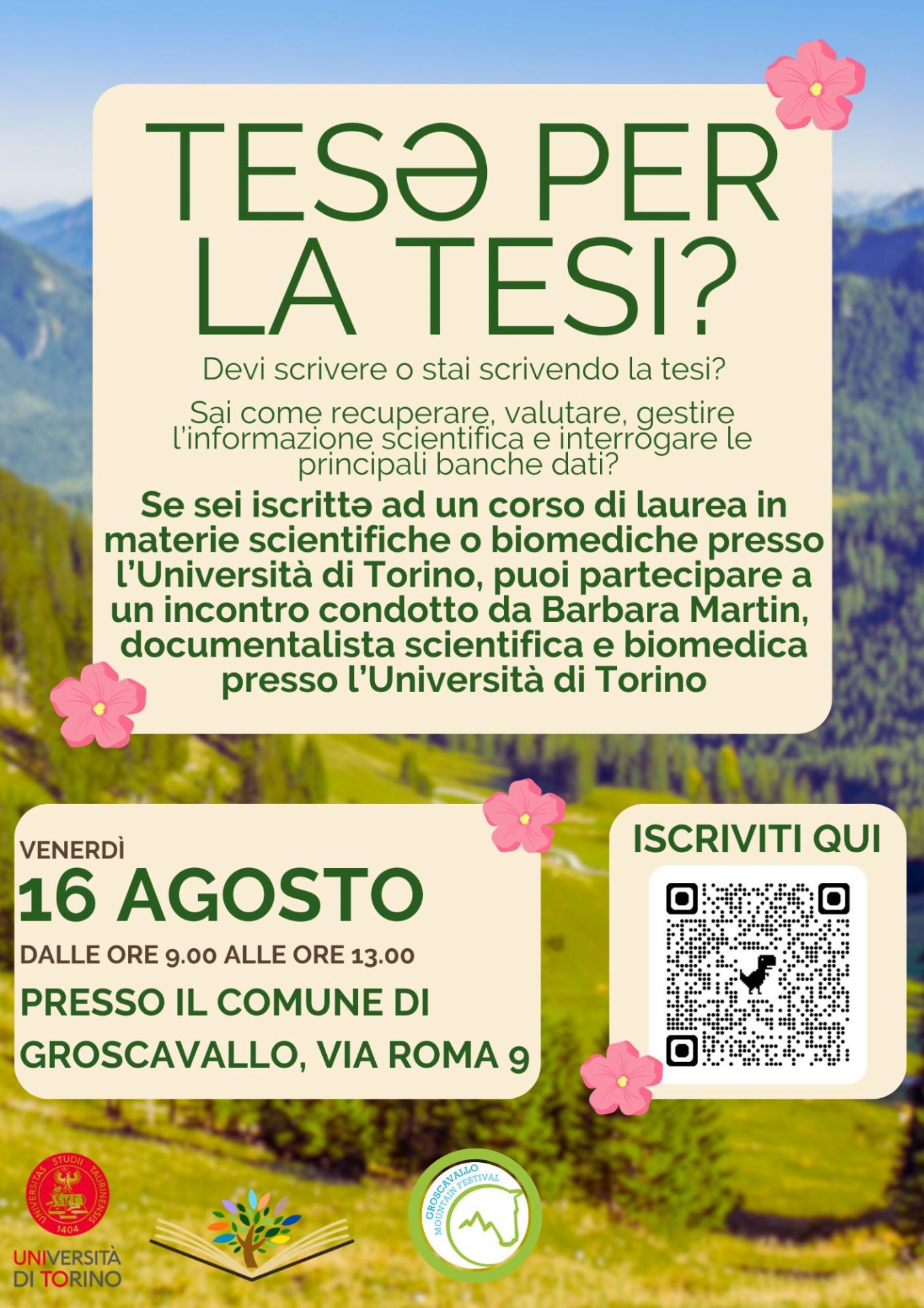 Venerdì 16 agosto l'Università di Torino, in collaborazione con il Groscavallo Mountain Festival, organizza 'TESI PER LA TESI?' un incontro condotto da Barbara Martin, documentalista scientifica e biomedica presso UniTo.