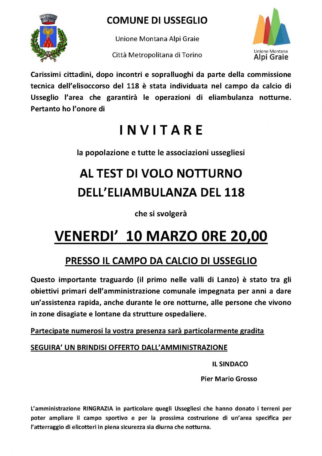 dopo incontri e sopralluoghi da parte della commissione tecnica dell’elisoccorso del 118 è stata individuata nel campo da calcio di Usseglio l’area che garantirà le operazioni di eliambulanza notturne.