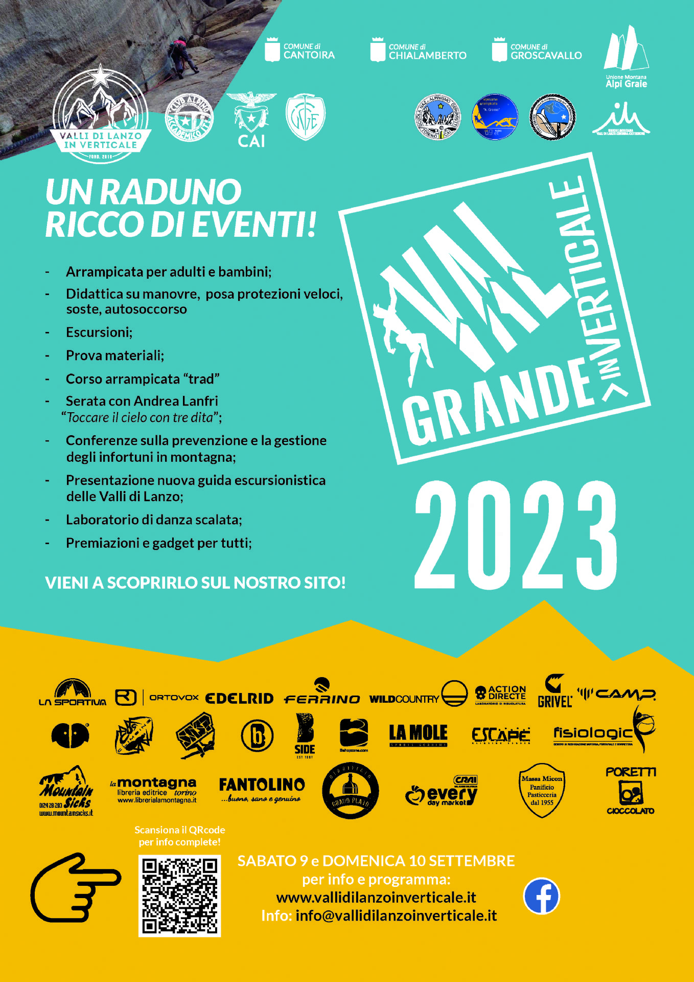 - Dalle ore 10.00: giornata promozionale di arrampicata rivolta agli adulti (maggiori di anni 16) presso i massi della frazione Balme di Cantoira. A cura della Scuola di Alpinismo “Alberto Grosso” del CAI Uget. Iscrizione obbligatoria entro giovedì 07/09 all’indirizzo email lanzoverticale@caiugetalp.com. La giornata è totalmente gratuita per i SOCI CAI di qualsiasi Sezione, mentre per i NON soci CAI è richiesto il versamento anticipato della quota assicurativa pari a 11,55 euro. Per i minori di 18 anni è necessaria la presenza di un genitore. Informazioni sul sito www.caiuget.it