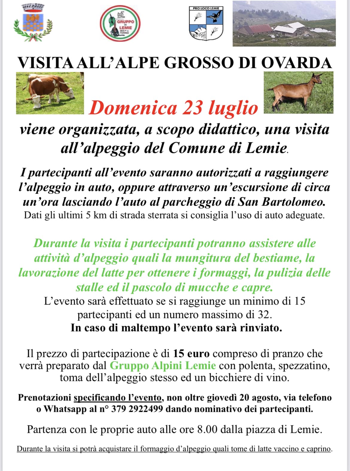 I partecipanti raggiungeranno l'alpeggio in macchina o con una camminata di un'ora circa, nell'ultimo tratto è consigliato usare macchine adatte a un terreno irregolare.