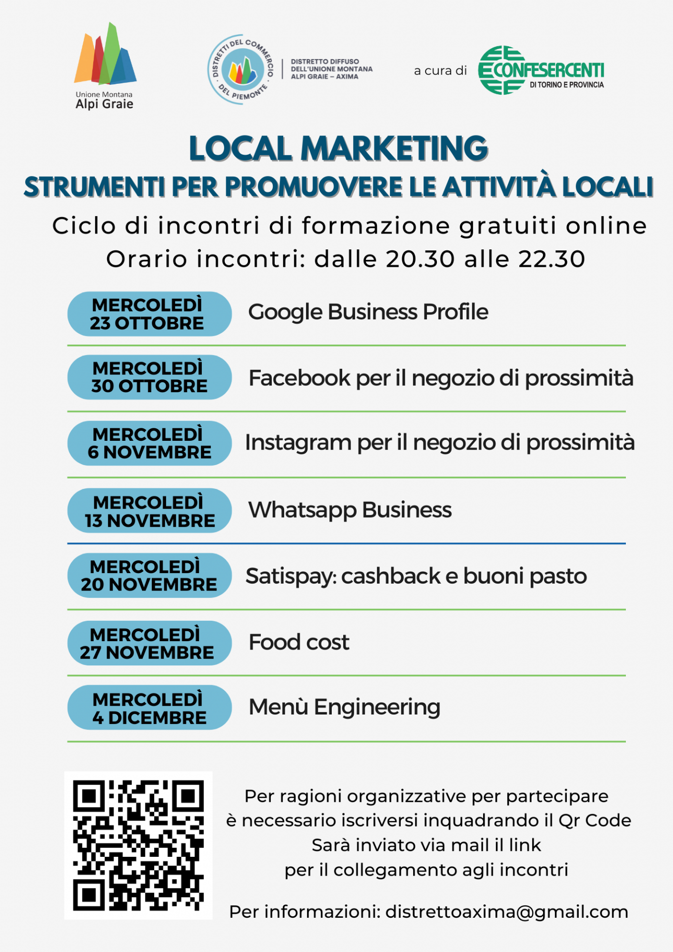 Orario incontri: dalle 20:30 alle 22:30.