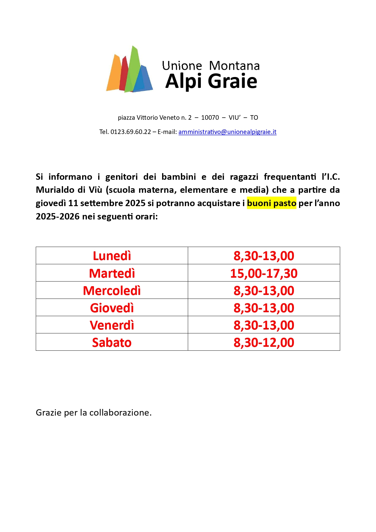 Orario Acquisto buoni mensa anno 2025-2026