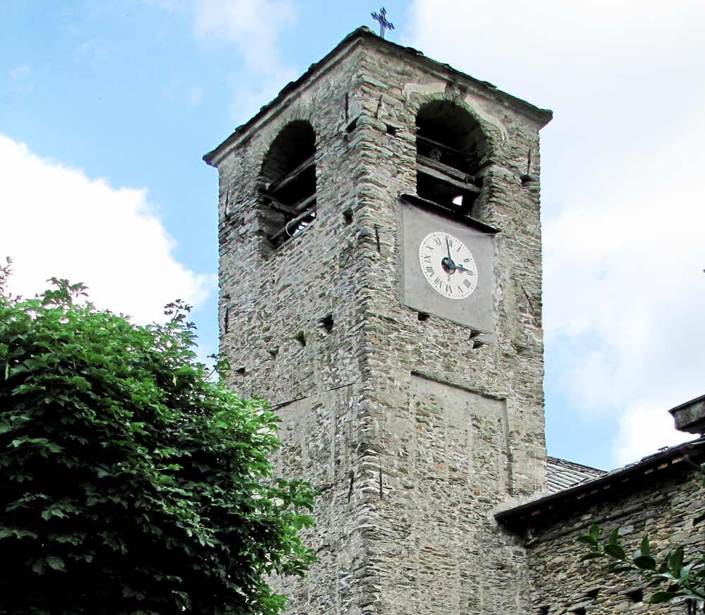 Notevole il campanile, risalente al 1100, il più antico di tutta la valle. La chiesa è stata più volte rimaneggiata, ma il campanile presenta ancora caratteri protoromanici fino al di sotto della cella campanaria. Per migliorare il passaggio della strada carrozzabile, nel 1959 fu troncata e sostituita la facciata. Anche l’assetto interno fu modificato nel tempo; l’altare maggiore ospita la pala della Madonna col Bambino e i Santi Giovanni Battista e Giovanni Evangelista; a sinistra, un pregevole Crocifisso settecentesco. Presso gli altri altari, a destra la Madonna del Rosario e la Vergine col Bambino e i Santi Giuseppe e Michele Arcangelo, a sinistra la Discesa dello Spirito Santo e la Pietà.