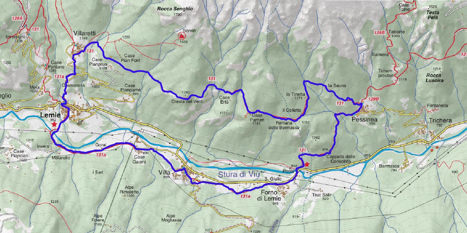 Facile ma lungo itinerario ad anello, adatto per le mezze stagioni. Permette di visitare tutte le frazioni di Lemie poste sul versante esposto al sole della vallata. Molto panoramico su tutte le montagne dell'alta valle. Nei mesi estivi invece il panorama è limitato in buona parte del percorso, percorrendo zone boschive.