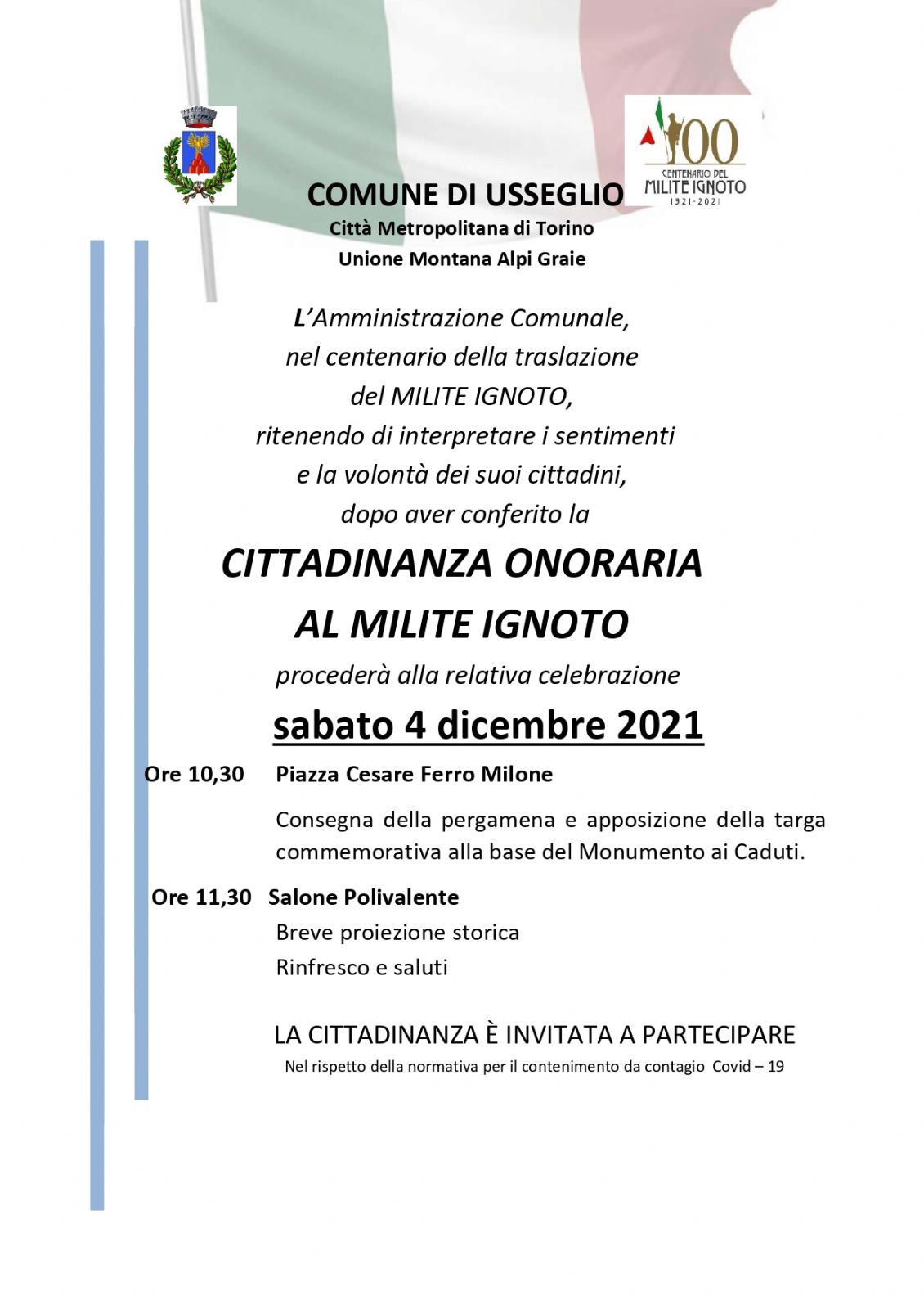 cittadinanza onoraria al Milite Ignoto procederà alla relativa celebrazione sabato 4 dicembre 2021 alle ore 10.30 in Piazza Cesare Ferro Milone.