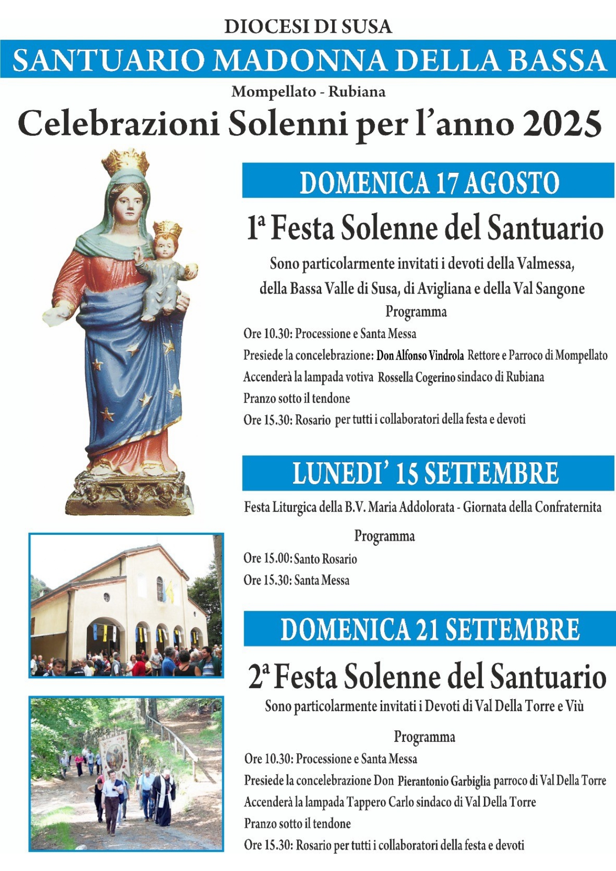 Il Santuario della Madonna della Bassa, situato tra i pittoreschi paesaggi della Bassa Valle di Susa, Mompellato e Rubiana, ospiterà diverse celebrazioni religiose per l'anno 2025. Questi eventi rappresentano un'occasione unica per i fedeli e i turisti di immergersi nella tradizione religiosa e culturale di questa zona montuosa.