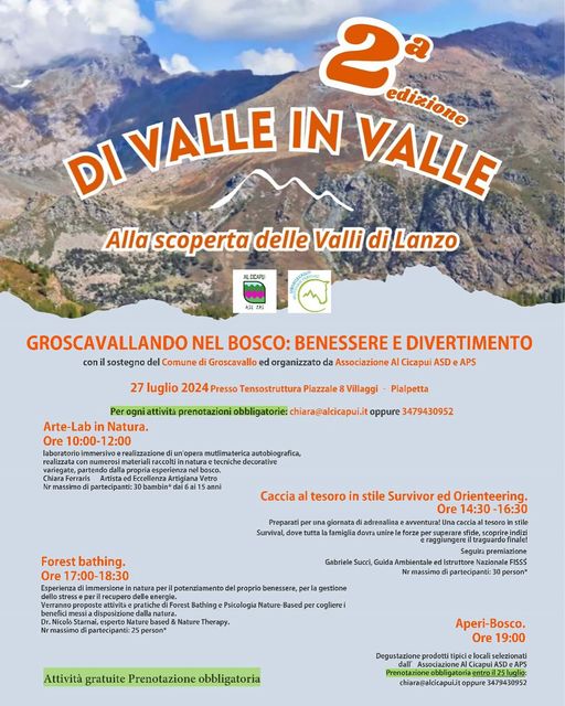 Sabato 27 luglio presso la Tensostruttura Piazzale 8 Villaggi a Pialpetta avrà luogo la 2^ edizione di "DI VALLE IN VALLE - alla scoperta delle Valli di Lanzo".