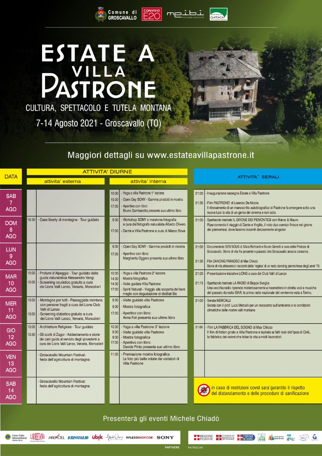 Dal 7 al 14 agosto Villa Pastrone apre le porte alla cultura : “Estate a Villa Pastrone” di Beppe Sveglia e Max Chicco, una manifestazione promossa dal Comune di Groscavallo con il sostegno economico e il patrocinio dell’Unione Montana Alpi Graie.