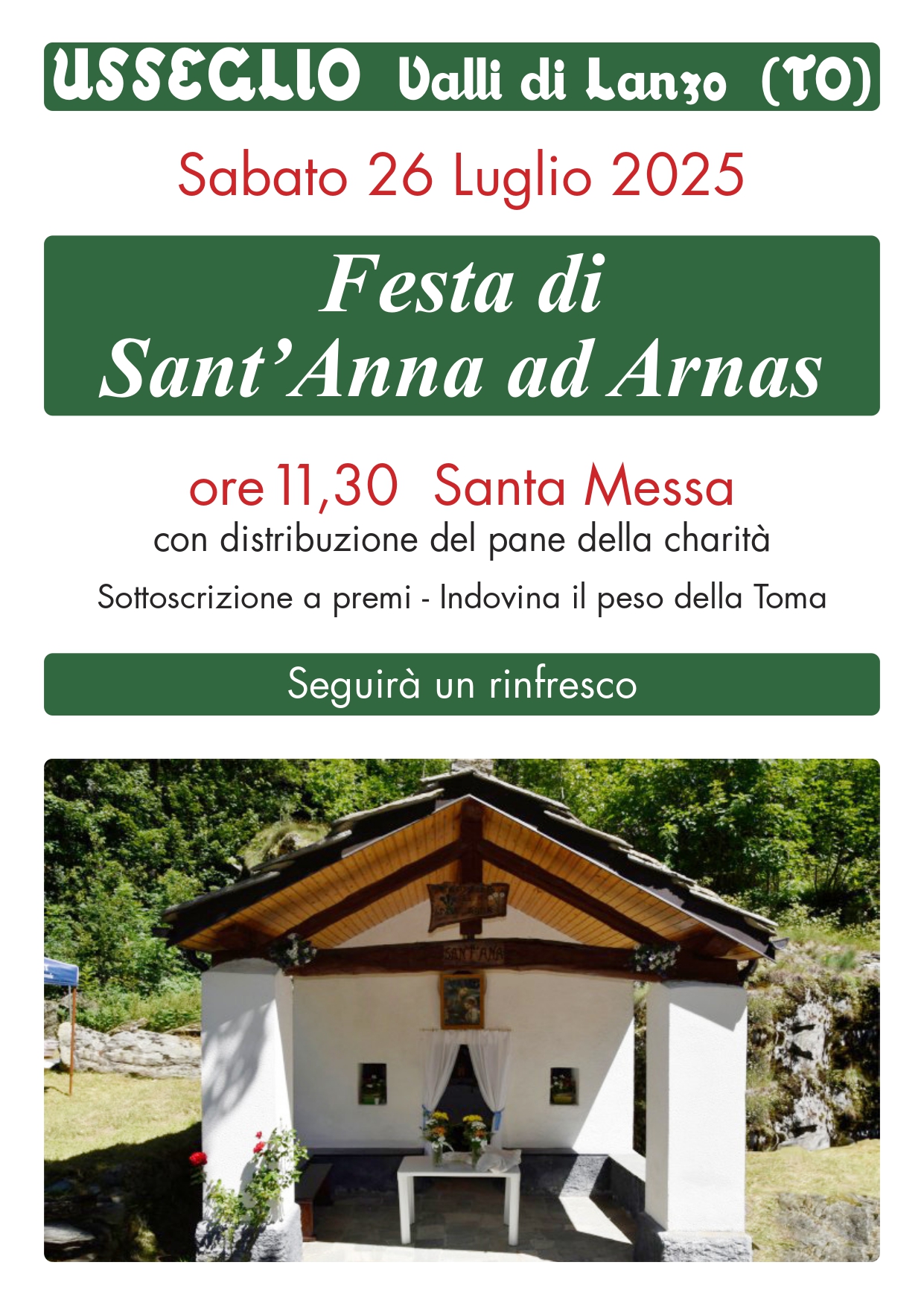 Unisciti a noi per celebrare la tradizionale Festa di Sant'Anna nel pittoresco borgo di Arnas, nel cuore delle Valli di Lanzo. La giornata si apre alle 11:30 con una suggestiva Santa Messa, durante la quale verrà distribuito il tradizionale pane della carità come segno di comunità e condivisione.