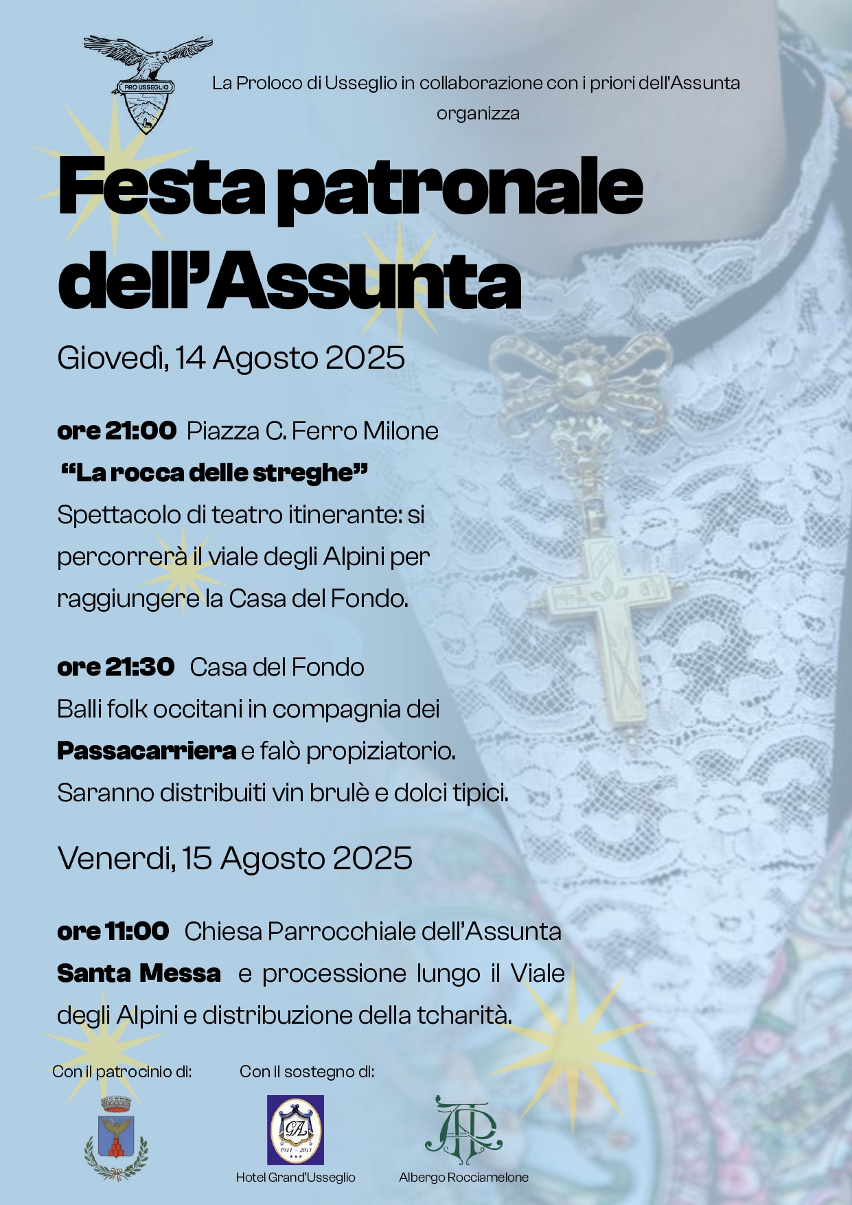 La Pro Loco di Usseglio, in collaborazione con i Priori dell’Assunta, vi invita a partecipare alla tradizionale Festa Patronale dell’Assunta, due giornate ricche di spiritualità, cultura e folklore locale.