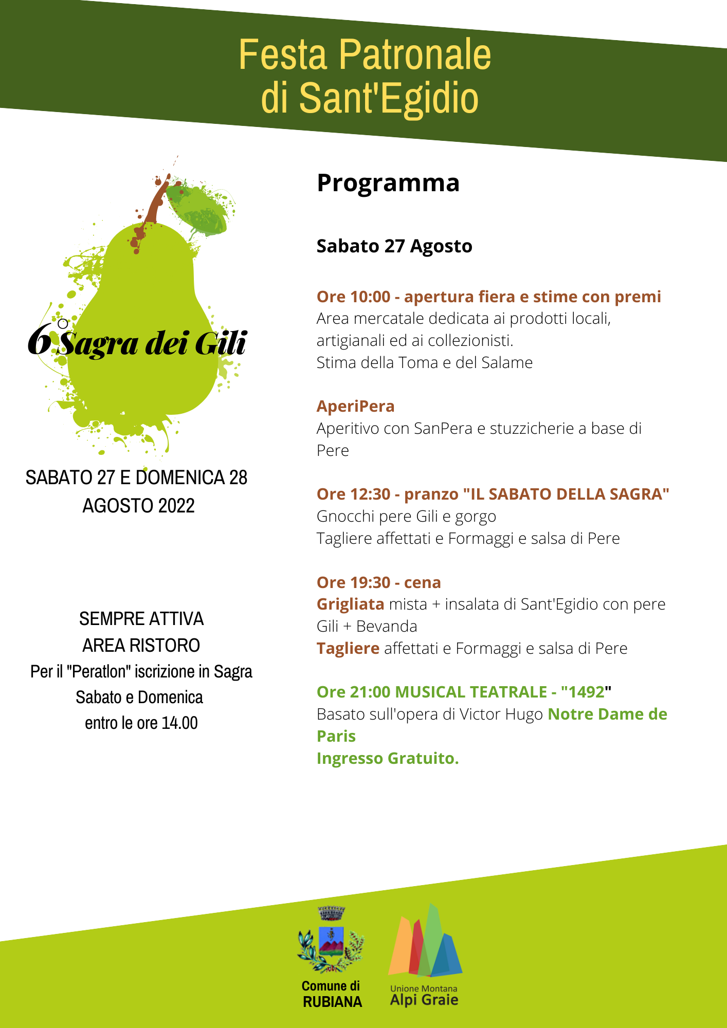 - ore 19.30: Cena con grigliata mista e insalata di Sant'Egidio: "Parigi 1482" musical teatrale ispirato a "Notre Dame de Paris" di Victor Hugo. Ingresso libero.