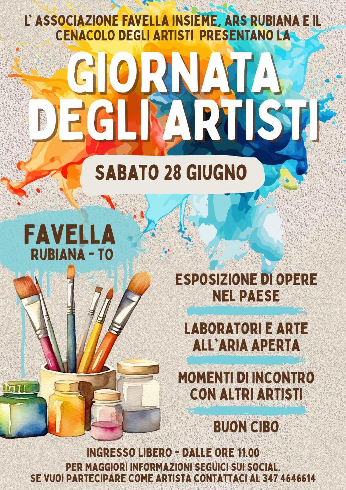 L'Associazione Favella Insieme, Ars Rubiana e il Cenacolo degli Artisti insieme al Comune di Rubiana sono felici di invitarvi ad una giornata speciale a Favella, affascinante paesino di montagna luogo di ispirazione e creatività immerso nella natura. Questa sarà un’occasione unica per ammirare e condividere l'arte, scambiare idee e trascorrere del tempo in compagnia di artisti e appassionati.
