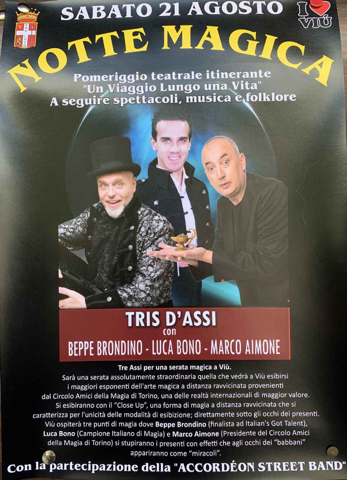 Tre assi per una serata magica a Viù: esibizione del maggioiri esponenti dell'arte magica provenienti dal Circolo Amici della Magia di Torino; si esibiranno con il "Close up", una forma di magia a distanza ravvicinata che si caratterizza per l'unicità della modalità di esibizione.