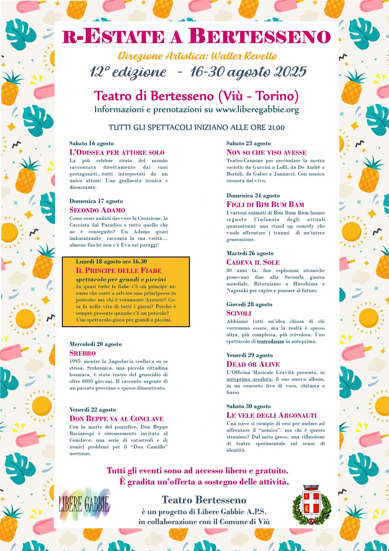 Dal 16 al 30 agosto 2025, il Teatro di Bertesseno (Viù, Torino) ospiterà la 12ª edizione di R-Estate a Bertesseno, una rassegna di spettacoli teatrali e musicali che promette di intrattenere il pubblico di tutte le età con una selezione di opere affascinanti e originali. Con la direzione artistica di Walter Revello, l'evento offre una panoramica di storie coinvolgenti, emozionanti e divertenti, tutte pensate per unire la tradizione e la contemporaneità.
