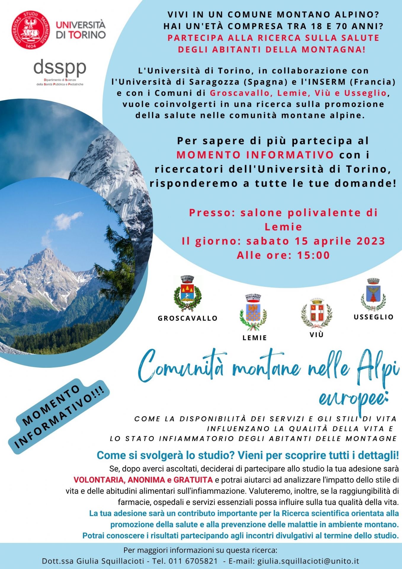 L'Università di Torino - in collaborazione con l'Università di Saragozza e l'INSERM e con i comuni di Lemie, Groscavallo, Viù e Usseglio - ha in progetto uno studio sulla salute della popolazione di montagna.