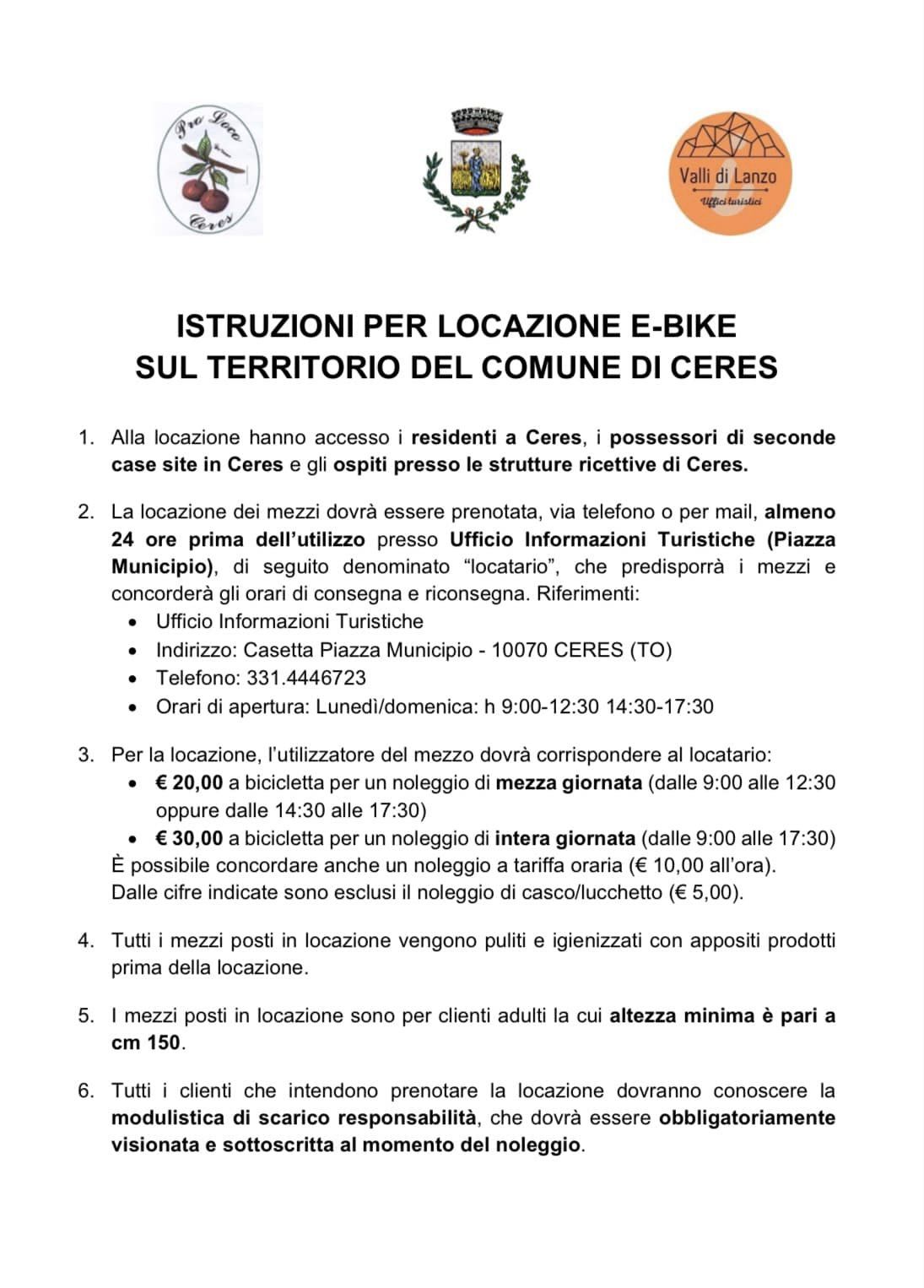 La locazione dei mezzi dovrà essere prenotata, via telefono (331 444 6723) o per e-mail (iat.ceres@gmail.com), almeno 24 ore prima dell'utilizzo presso l'Ufficio Informazioni Turistiche di Ceres (Piazza del Municipio), che predisporrà i mezzi e concorderà gli orari di consegna e riconsegna dei mezzi.