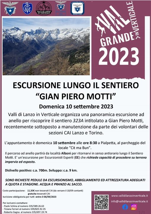 - Ore 8.30 presso Bar Cit ma Bun: partenza dell’escursione sul Sentiero Motti recentemente ripristinato con le Sezioni CAI aderenti a Valli di Lanzo in Verticale. Iscrizione obbligatoria entro giovedì 01/09; Per info, conferma dell’orario e ritrovo contattare il sig. Paolo Schina al numero 335/589.26.63 oppure la sig.ra Tiziana Ferrari al numero 339/825.92.35 oppure sig. Federico Camedda al numero 338/622.70.51