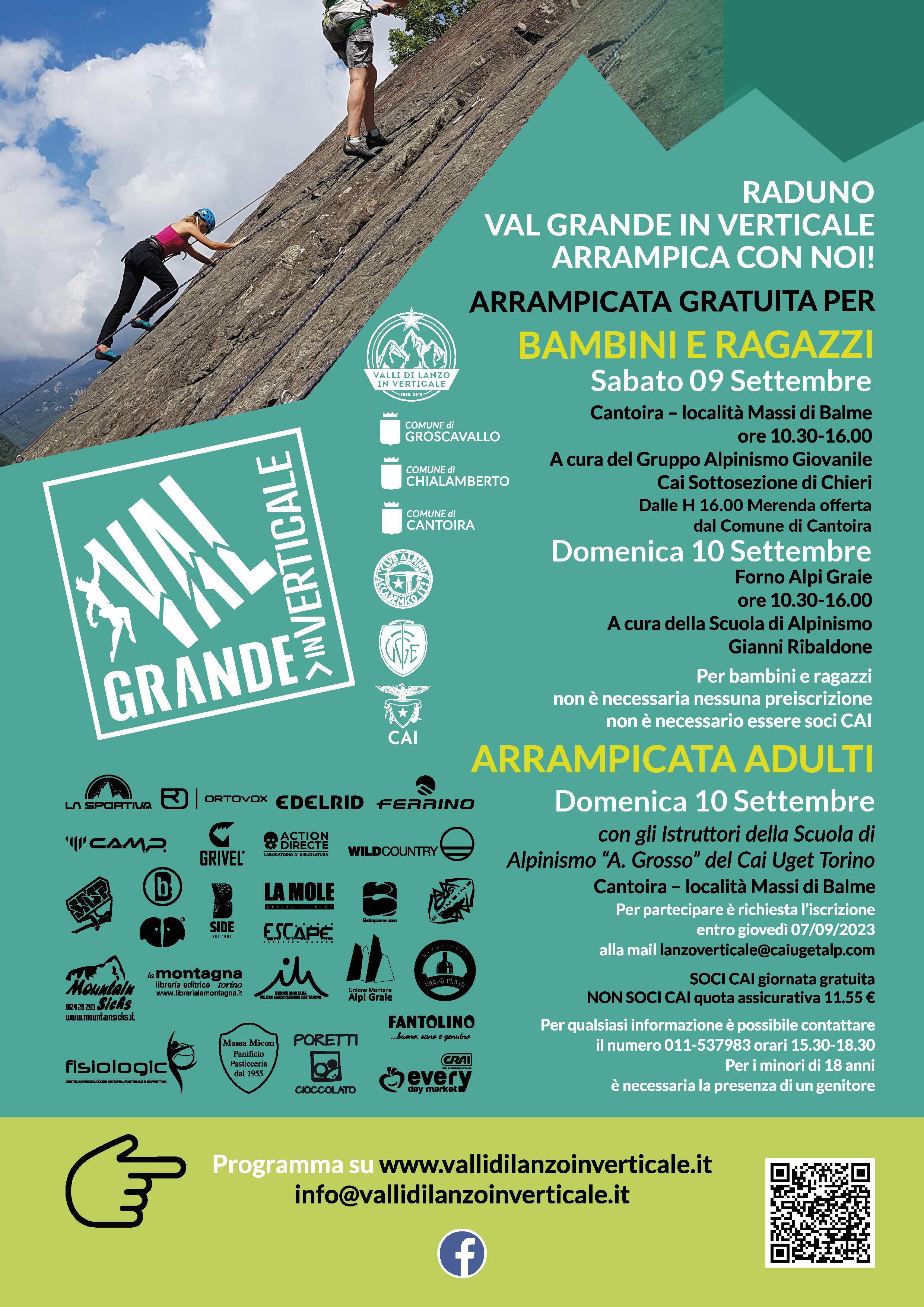 - Dalle ore 10.00: giornata promozionale di arrampicata rivolta agli adulti (maggiori di anni 16) presso i massi della frazione Balme di Cantoira. A cura della Scuola di Alpinismo “Alberto Grosso” del CAI Uget. Iscrizione obbligatoria entro giovedì 07/09 all’indirizzo email lanzoverticale@caiugetalp.com. La giornata è totalmente gratuita per i SOCI CAI di qualsiasi Sezione, mentre per i NON soci CAI è richiesto il versamento anticipato della quota assicurativa pari a 11,55 euro. Per i minori di 18 anni è necessaria la presenza di un genitore. Informazioni sul sito www.caiuget.it
