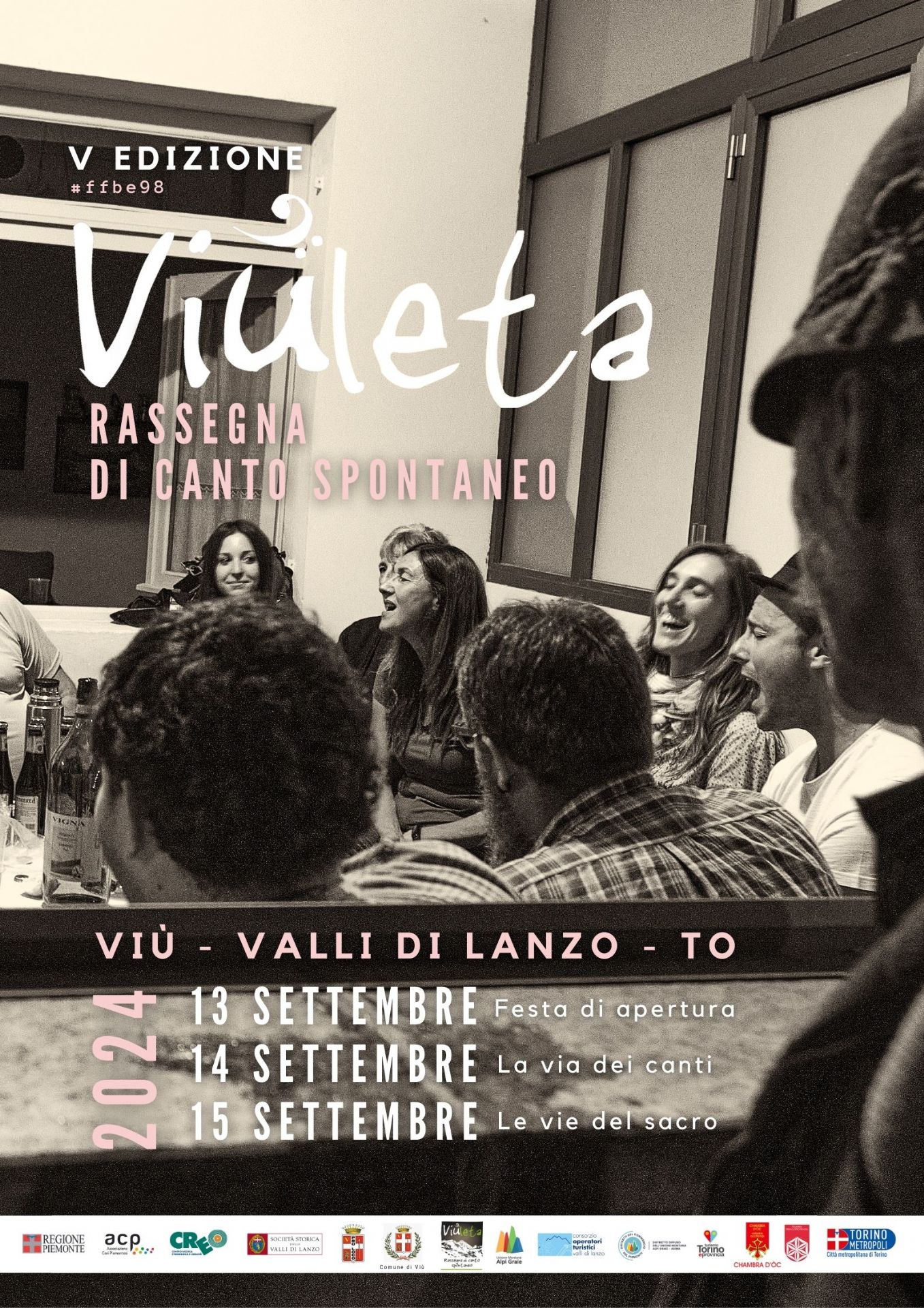 Sabato 14 settembre: LA VIA DEI CANTI, il vero e intenso momento della rassegna dedicato al canto spontaneo. Prevede dal pomeriggio la presentazione del grande lavoro di ricerca e restituzione di Amerigo Vigliermo, del Coro Bajolese e dell Centro Etnologico Canavesano (CEC) sull'importante tradizione del canto spontaneo nel Canavese con il libro “OPERA OMNIA” di Amerigo Vigliermo e Gian Carlo Biglia. L'assegnazione del PREMIO VIULETA, un premio dedicato ogni anno a un soggetto, selezionato dall'organizzazione, che si è distinto nella promozione, documentazione, studio e diffusione del canto spontaneo. Una presentazione ufficiale di tutti i gruppi ospiti e, alla sera, i canti UNIONE MONTANA ALPI GRAIE - Prot 0001816 del 05/09/2024 Tit VII Cl 6 Fasc