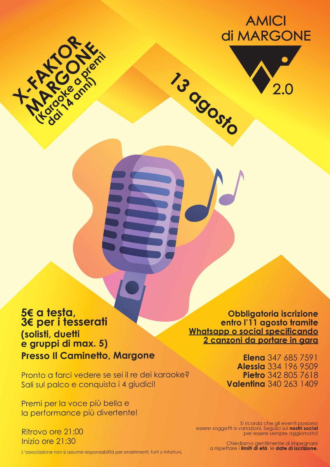 Obbligatoria iscrizione entro l'11 agosto tramite WHATSAPP o SOCIAL, specificando 2 canzoni da portare in gara