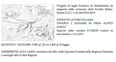Progetto di taglio boschivo di diradamento da eseguirsi nelle vicinanze della località Balma- Pianas. AVVISO DI GARA per vendita legname in piedi - SCADENZA 11 APRILE 2019
